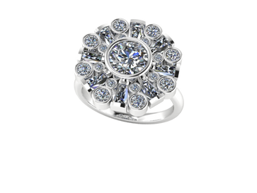 Features a round center stone, accented by eight tapered baguettes and sixteen round stones for a bold design that's sure to shine.